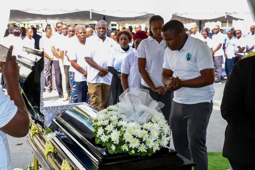 ↑2025年6月20日,在坦桑尼亞達累斯薩拉姆穆欣比利國立醫院,人們在追悼會上向張軍橋醫生遺體告別。新華社發
