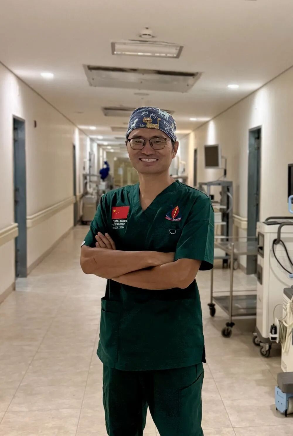 ↑2025年5月18日,第27批中國援坦桑尼亞醫療隊隊長張軍橋在達累斯薩拉姆穆欣比利國立醫院留影。新華社發