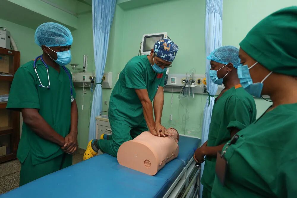 ↑↓2025年5月9日,在坦桑尼亞達累斯薩拉姆穆欣比利國立醫院,張軍橋醫生(左二)示范心肺復蘇急救。新華社發(埃馬紐埃爾·赫爾曼攝)